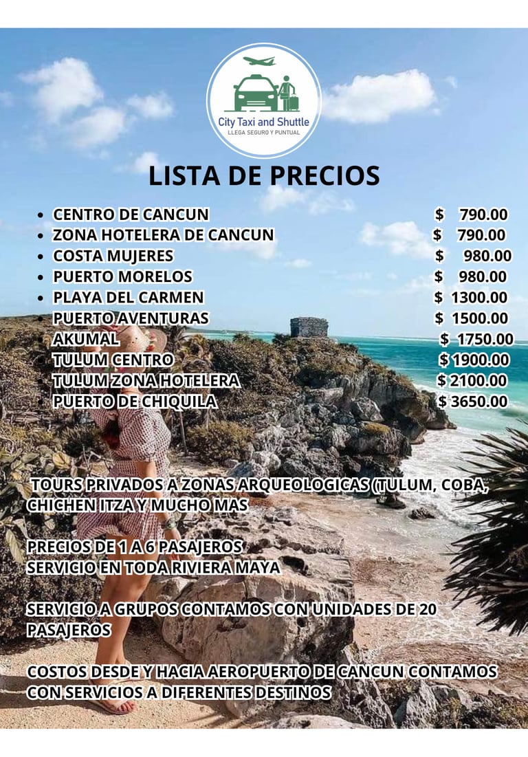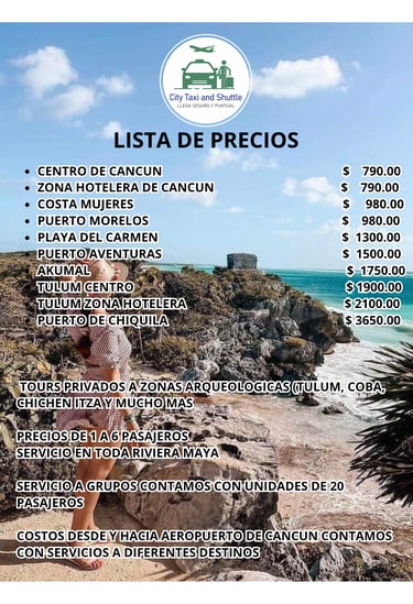 Te presentamos nuestras tarifas actualizadas para los destinos más solicitados desde el Aeropuerto Internacional de Cancún. En City Taxi and Shuttle nos enfocamos en ofrecerte un servicio seguro, cómodo y puntual, con precios accesibles y atención personalizada.